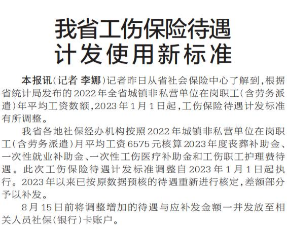 记者昨日从省社会保险中心了解到,根据省统计局发布的2022年全省城镇非私营单位在岗职工(含劳务派遣)年平均工资数额,2023年1月1日起,工伤保险待遇计发标准有所调整。(今日《郑州日报》2版)
