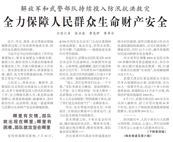 习近平主席对防汛救灾工作作出重要指示。解放军和武警部队官兵坚决听从统帅号令,闻令而动、冲锋在前、勇挑重担,持续奋战在防汛救灾一线,以实际行动诠释了人民至上的使命和担当。(今日《人民日报》1版、4版)