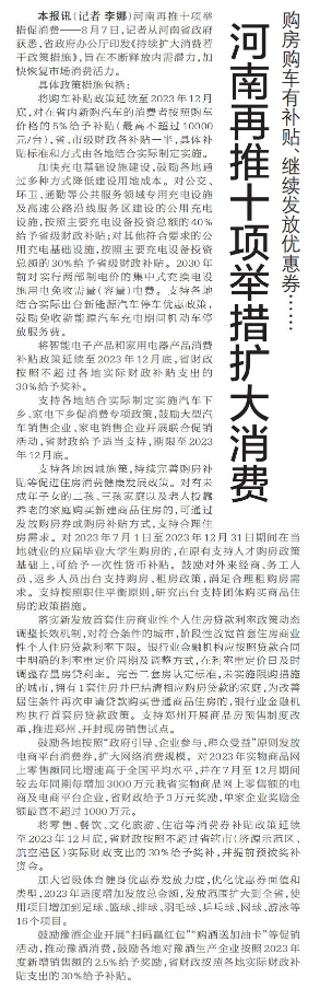 河南再推十项举措促消费——8月7日,记者从河南省政府获悉,省政府办公厅印发《持续扩大消费若干政策措施》,旨在不断释放内需潜力,加快恢复市场消费活力。(今日《郑州日报》1版)