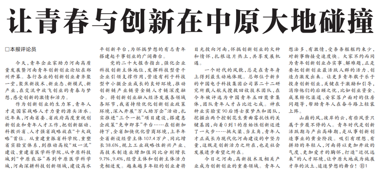 今天,青年企业家助力河南高质量发展暨河南青年创新创业论坛在郑州开幕。各行各业的创新创业者齐聚一堂,聚焦新技术、新业态、新模式、新产业,在交流中放飞创业的青春与梦想,感受创新的激情和活力。(今日《河南日报》2版)