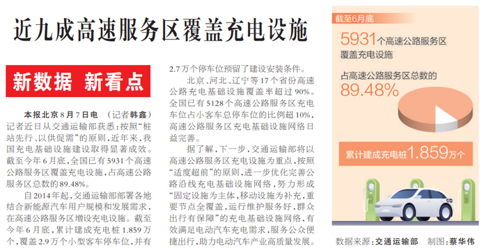 记者近日从交通运输部获悉:按照“桩站先行、以供促需”的原则,近年来,我国充电基础设施建设取得显著成效。截至今年6月底,全国已有5931个高速公路服务区覆盖充电设施,占高速公路服务区总数的89.48%。(今日《人民日报》1版)