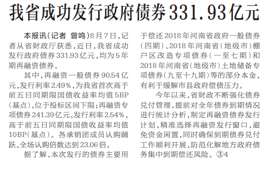 8月7日,记者从省财政厅获悉,近日,我省成功发行政府债券331.93亿元,均为5年期再融资债券。(今日《河南日报》2版)