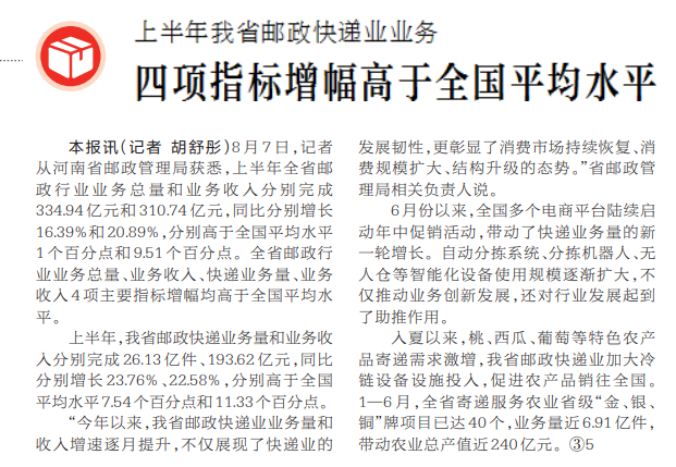 8月7日,记者从河南省邮政管理局获悉,上半年全省邮政行业业务总量和业务收入分别完成334.94亿元和310.74亿元,同比分别增长16.39%和20.89%,分别高于全国平均水平1个百分点和9.51个百分点。全省邮政行业业务总量、业务收入、快递业务量、业务收入4项主要指标增幅均高于全国平均水平。(今日《河南日报》3版)