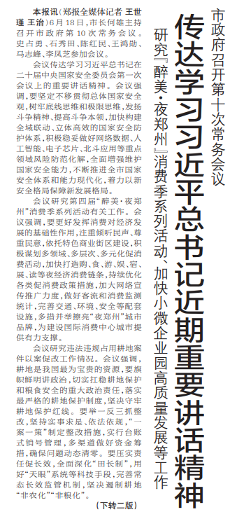 6月18日,市长何雄主持召开市政府第10次常务会议。史占勇、石秀田、陈红民、王鸿勋、马志峰、李凤芝参加会议。(今日《郑州日报》1版、2版)