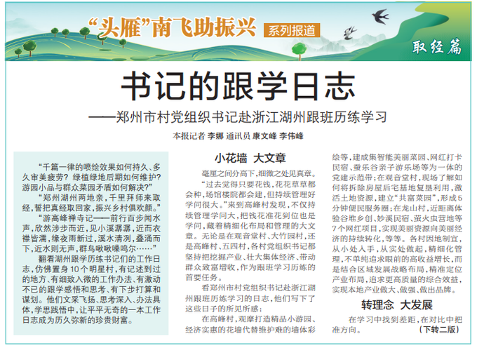 翻看湖州跟学历练书记们的工作日志,仿佛置身10个明星村,有记述到过的地方、有细致入微的工作办法、有激动不已的跟学感悟和思考、有下步打算和谋划。他们文采飞扬、思考深入、办法具体,学思践悟中,让平平无奇的一本工作日志成为历久弥新的珍贵财富。(今日《郑州日报》1版、2版)