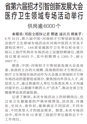 6月18日,第六届中国·河南招才引智创新发展大会医疗卫生领域专场活动在河南中医药大学龙子湖校区举行。144家省属医疗卫生单位和全省三级以上医疗机构在专场活动上设置招聘展位,提供岗位需求6083个,其中招聘博士1385个、硕士3667个。(今日《郑州日报》1版)