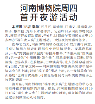 五月五,是端阳,门插艾,香满堂,吃粽子,撒白糖,龙舟下水喜洋洋。记者昨日从河南博物院获悉,该院将开放首次夜游,于6月22日端午节当晚6点至10点举办“端午夜未央”主题活动,一大波夜间惊喜等您来。(今日《郑州日报》1版)
