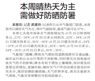 记者昨日从市气象部门获悉,本周我市以晴好天气为主,周中气温较高,最高气温可达37℃。(今日《郑州日报》1版)