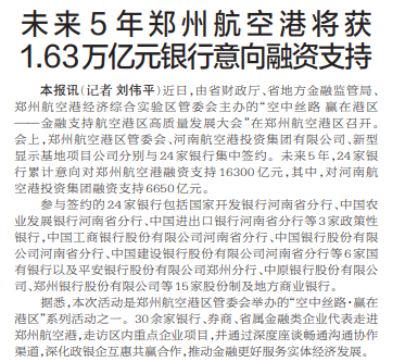 未来5年郑州航空港将获1.63万亿元银行意向融资支持