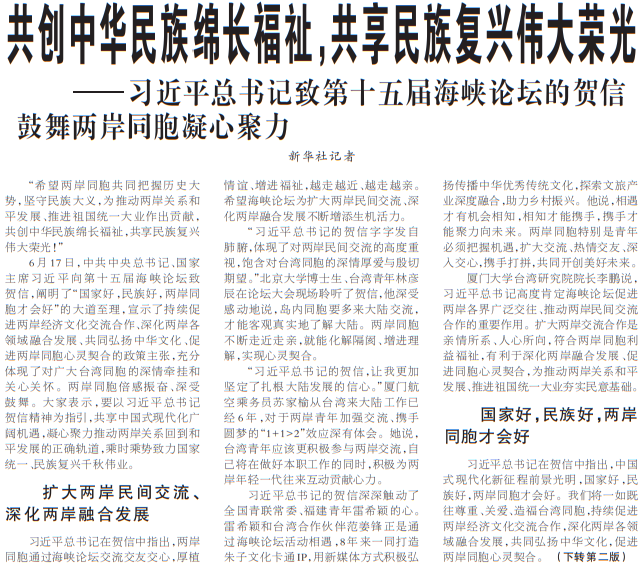6月17日,中共中央总书记、国家主席习近平向第十五届海峡论坛致贺信,阐明了“国家好,民族好,两岸同胞才会好”的大道至理,宣示了持续促进两岸经济文化交流合作、深化两岸各领域融合发展、共同弘扬中华文化、促进两岸同胞心灵契合的政策主张,充分体现了对广大台湾同胞的深情牵挂和关心关怀。两岸同胞倍感振奋、深受鼓舞。大家表示,要以习近平总书记贺信精神为指引,共享中国式现代化广阔机遇,凝心聚力推动两岸关系回到和平发展的正确轨道,乘时乘势致力国家统一、民族复兴千秋伟业。(今日《人民日报》1版、2版)
