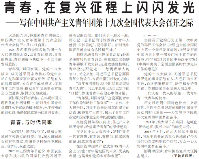 火热的六月,将迎来青春的盛会。中国共产主义青年团第十九次全国代表大会将于6月19日启幕。