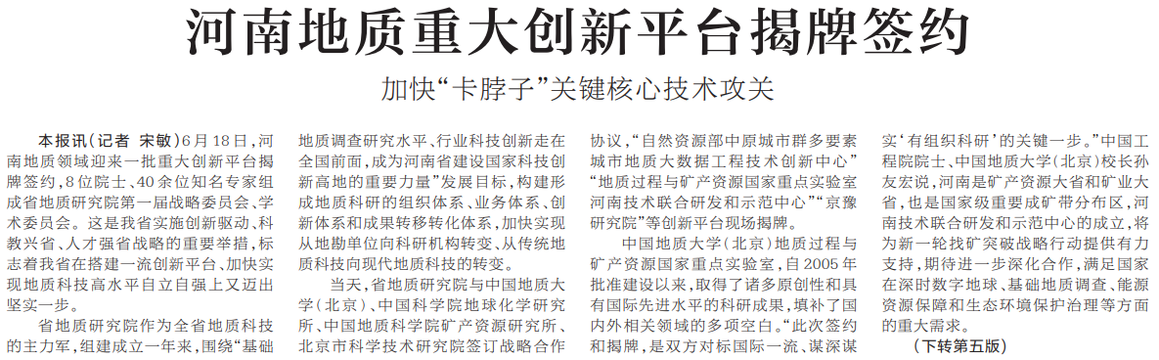 河南地质重大创新平台揭牌签约