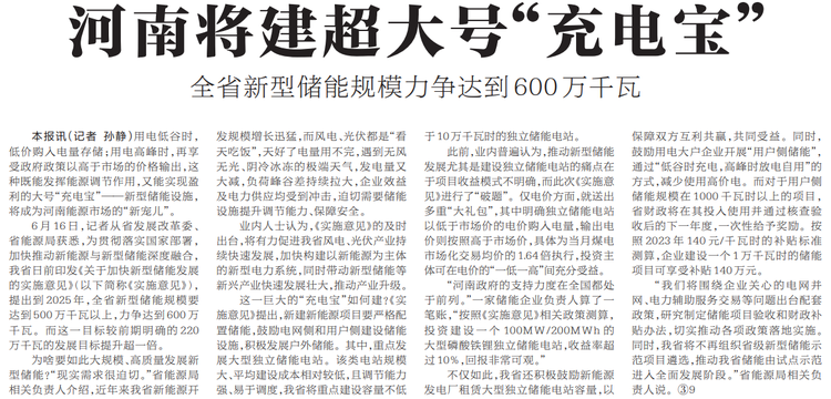 全省新型储能规模力争达到600万千瓦
