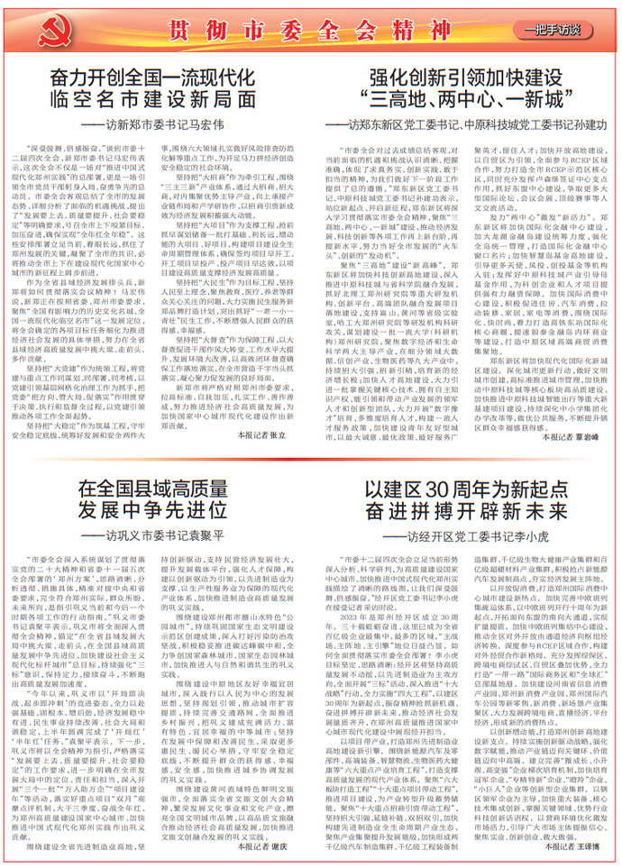 “市委全会对过去成绩总结客观,对当前面临的机遇和挑战认识清晰、把握准确,体现了求真务实、创新实践、敢于担当的精神,为我们做好下一阶段工作提供了总的遵循。”郑东新区党工委书记、中原科技城党工委书记孙建功表示,站位新起点、开启新征程,郑东新区将深入学习贯彻落实市委全会精神,聚焦“三高地、两中心、一新城”建设,推动经济发展、科技创新等各项工作再上新台阶、再提新水平,努力当好全市发展的“火车头”、创新的“发动机”。(今日《郑州日报》2版)