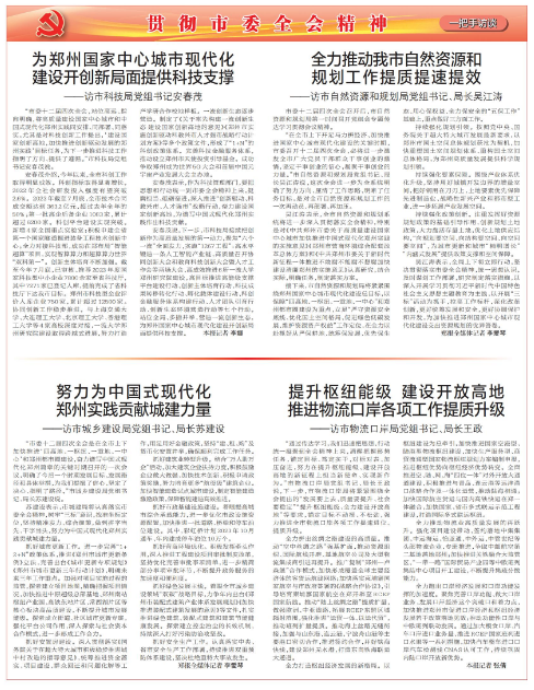 “市委十二届四次全会是在全市上下加快推进‘四高地、一枢纽、一重地、一中心’和郑州都市圈建设,奋力谱写中国式现代化郑州篇章的关键时期召开的一次会议,明确了今后一个时期发展目标、发展路径和具体举措,为我们提振了信心、坚定了决心、指明了路径。”市城乡建设局党组书记、局长苏建设说。(今日《郑州日报》3版)