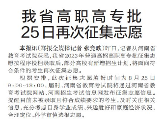 昨日,记者从河南省教育考试院获悉,我省2023年普通高招高职高专批征集志愿按程序投档录取后,部分高校有新增招生计划,将面向符合条件的考生再次征集志愿。(今日《郑州日报》5版)