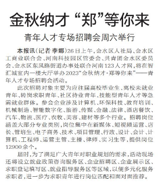 26日上午,金水区人社局、金水区工商业联合会、河南科技园区管委会、共青团金水区委员会、金水区东风路街道办事处联合河南123人才网,将在智汇城室内一楼大厅举办2023“金秋纳才·郑等你来”——青年人才专场招聘会活动。(今日《郑州日报》5版)