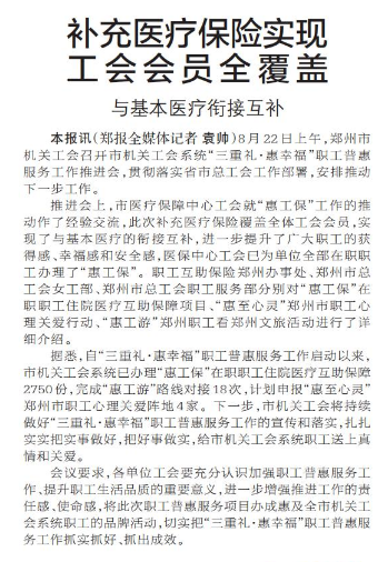 8月22日上午,郑州市机关工会召开市机关工会系统“三重礼·惠幸福”职工普惠服务工作推进会,贯彻落实省市总工会工作部署,安排推动下一步工作。(今日《郑州日报》5版)