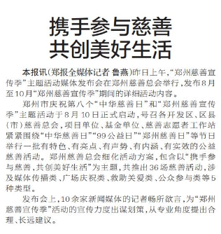 昨日上午,“郑州慈善宣传季”主题活动媒体发布会在郑州慈善总会举行,发布8月至10月“郑州慈善宣传季”期间的详细活动内容。(今日《郑州日报》5版)