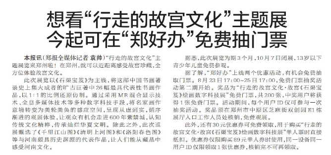 “行走的故宫文化”主题展览来郑州啦!在郑州,就可以近距离感受故宫珍藏,全方位体验故宫文化。(今日《郑州日报》5版)
