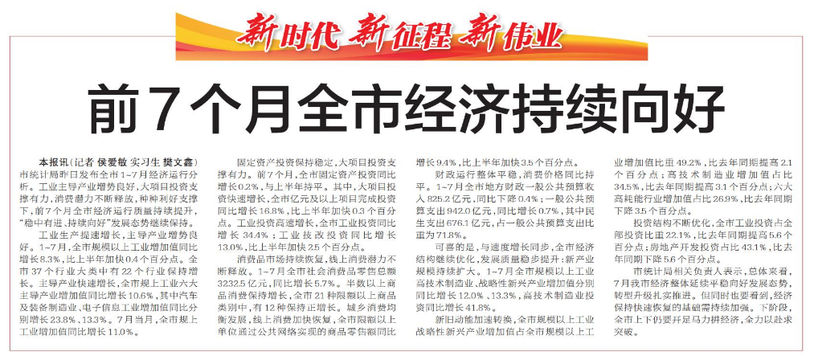 市统计局昨日发布全市1~7月经济运行分析。工业主导产业增势良好,大项目投资支撑有力,消费潜力不断释放,种种利好支撑下,前7个月全市经济运行质量持续提升,“稳中有进、持续向好”发展态势继续保持。(今日《郑州日报》6版)