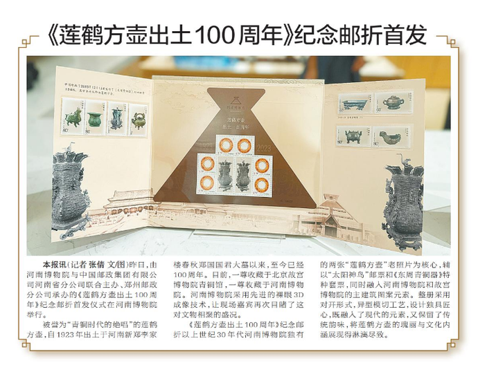 昨日,由河南博物院与中国邮政集团有限公司河南省分公司联合主办、郑州邮政分公司承办的《莲鹤方壶出土100周年》纪念邮折首发仪式在河南博物院举行。(今日《郑州日报》6版)