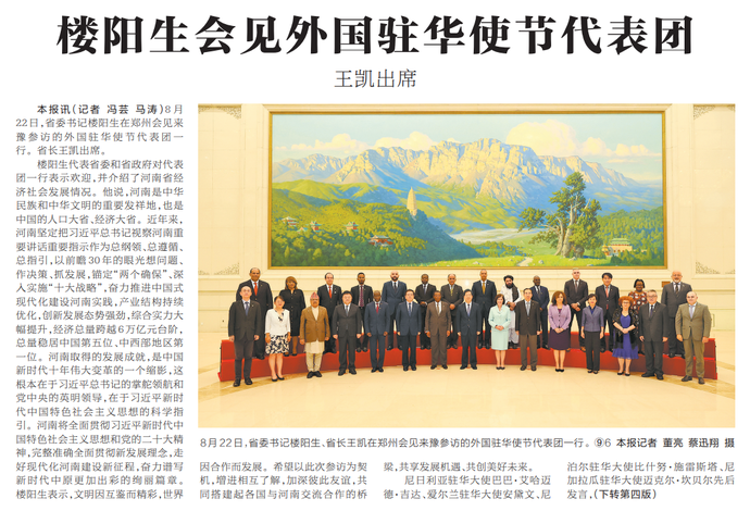 8月22日,省委书记楼阳生在郑州会见来豫参访的外国驻华使节代表团一行。省长王凯出席。