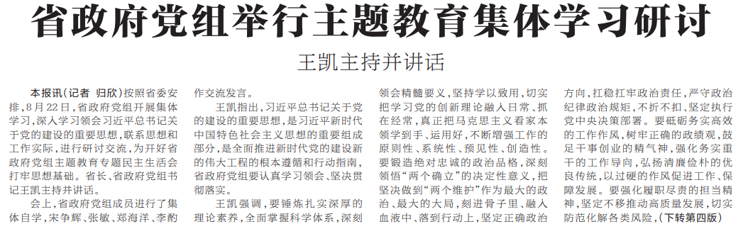 按照省委安排,8月22日,省政府党组开展集体学习,深入学习领会习近平总书记关于党的建设的重要思想,联系思想和工作实际,进行研讨交流,为开好省政府党组主题教育专题民主生活会打牢思想基础。省长、省政府党组书记王凯主持并讲话。(今日《河南日报》1版、4版)