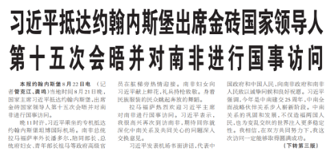 当地时间8月21日晚,国家主席习近平抵达约翰内斯堡,出席金砖国家领导人第十五次会晤并对南非进行国事访问。(今日《人民日报》1版、3版)