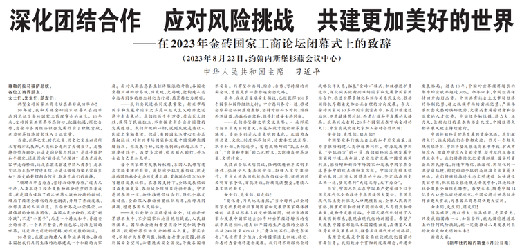 当地时间8月22日下午,国家主席习近平向约翰内斯堡金砖国家工商论坛闭幕式发表题为《深化团结合作 应对风险挑战 共建更加美好的世界》的致辞。(今日《人民日报》2版)