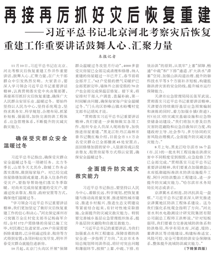 11月10日,习近平总书记在北京、河北考察灾后恢复重建工作并作重要讲话,鼓舞人心、汇聚力量,在广大干部群众中引发热烈反响。大家表示,要深入学习领会习近平总书记重要讲话精神,认真贯彻落实党中央决策部署,再接再厉抓好灾后恢复重建,确保广大人民群众安居乐业、温暖过冬。要始终坚持以人民为中心,坚持系统观念,坚持求真务实、科学规划、合理布局,抓紧补短板、强弱项,加快完善防洪工程体系、应急管理体系,不断提升防灾减灾救灾能力。(今日《人民日报》1版、4版)
