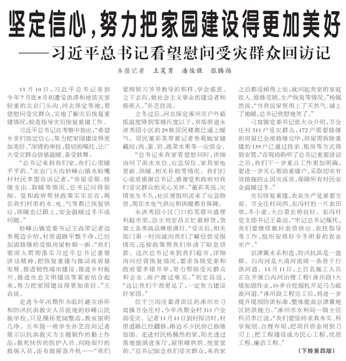 习近平总书记在考察中指出,“希望乡亲们坚定信心,努力把家园建设得更加美好。”深情的牵挂,殷切的嘱托,让广大受灾群众倍感温暖、备受鼓舞。(今日《人民日报》1版、4版)
