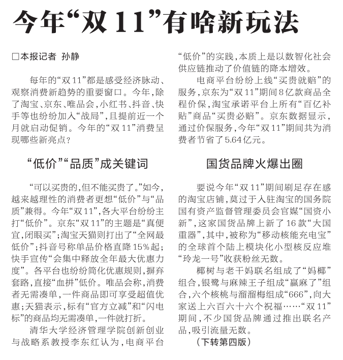 每年的“双11”都是感受经济脉动、观察消费新趋势的重要窗口。今年,除了淘宝、京东、唯品会,小红书、抖音、快手等也纷纷加入“战局”,且提前近一个月就启动促销。今年的“双11”消费呈现哪些新亮点?(今日《河南日报》1版、4版)