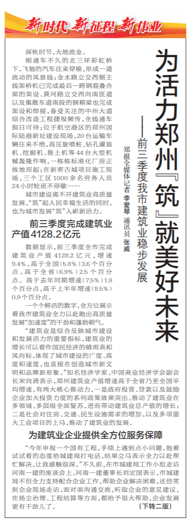 城市建设离不开建筑业高质量发展,“筑”起人民幸福生活的同时,也为城市发展“筑”入崭新活力。(今日《郑州日报》1版、2版)