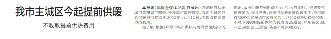 记者昨日从市城市管理局了解到,经报请市政府同意,我市主城区开始供暖时间提前至2023年11月12日,不收取提前供热的费用。