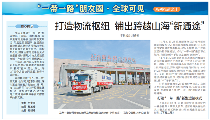 好消息接踵而至,好政策纷至沓来。郑州正在以国际综合交通枢纽的身份,拓展自身朋友圈,在深度融入共建“一带一路”的坦途上越跑越快。(今日《郑州日报》1版、2版)
