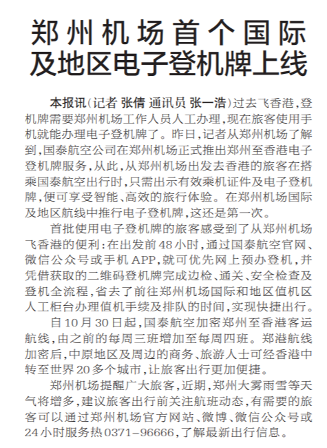 过去飞香港,登机牌需要郑州机场工作人员人工办理,现在旅客使用手机就能办理电子登机牌了。昨日,记者从郑州机场了解到,国泰航空公司在郑州机场正式推出郑州至香港电子登机牌服务,从此,从郑州机场出发去香港的旅客在搭乘国泰航空出行时,只需出示有效乘机证件及电子登机牌,便可享受智能、高效的旅行体验。在郑州机场国际及地区航线中推行电子登机牌,这还是第一次。(今日《郑州日报》2版)