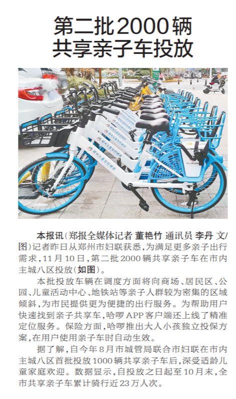 记者昨日从郑州市妇联获悉,为满足更多亲子出行需求,11月10日,第二批2000辆共享亲子车在市内主城八区投放(如图)。(今日《郑州日报》2版)