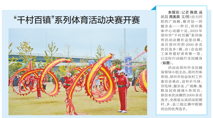 活力四射的广场舞、整齐划一的健步走……昨日,郑州奥体中心动感十足,2023年郑州市“千村百镇”系列体育活动决赛在这里启幕。来自郑州市的2000余名农民及乡(镇、办)企业职工体育爱好者欢聚一堂,以实际行动践行全民健身(如图)。(今日《郑州日报》2版)