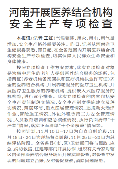 气温骤降,用火、用电、用气量增加,安全生产格外需要关注。昨日,记者从河南省卫生健康委获悉,即日起,在全省范围内开展医养结合机构安全生产专项检查,切实保障人民群众生命安全和身体健康。(今日《郑州日报》2版)