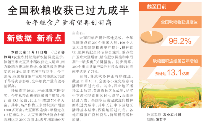 农业农村部最新农情调度显示:伴随玉米大豆及中稻收获进入尾声、南方晚稻收获加速推进,全国秋粮收获进度达96.2%,基本实现丰收到手。今年以来,我国粮食生产克服局部地区洪涝干旱等灾害影响,全年粮食产量有望再创新高。(今日《人民日报》1版)