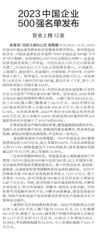 9月20日~21日,2023中国500强企业高峰论坛在安徽省合肥市举办。由中国企业联合会、中国企业家协会评选的“2023中国企业500强”于9月20日揭晓。国家电网以3.57万亿元营收位列第一,这也是国家电网连续第三年夺冠。中国石油以3.25万亿元营收排名第二,中国石化以3.17万亿元营收排名第三。中国建筑、工商银行、建设银行、农业银行、平安保险、中国中化、中国中铁进入前十。榜单显示,16家企业营收突破万亿元。河南省有12家企业上榜中国企业500强,较去年多了1家,其中,万洲国际有限公司排名第144位。(今日《郑州日报》1版)
