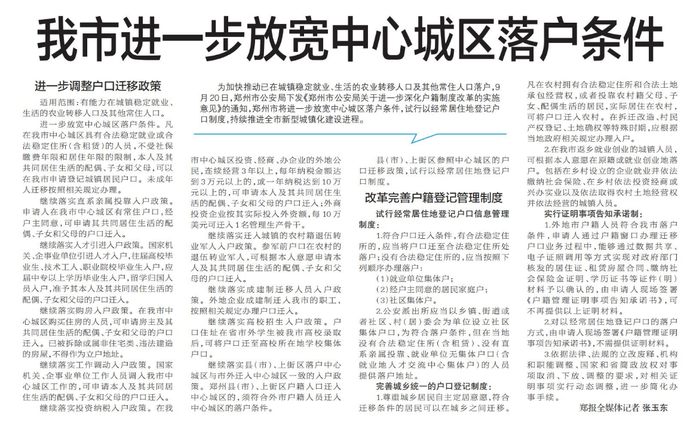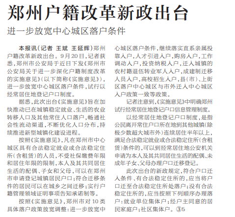 郑州户籍改革新政出台。9月20日,记者获悉,郑州市公安局于近日下发《郑州市公安局关于进一步深化户籍制度改革的实施意见》(以下简称《实施意见》),进一步放宽中心城区落户条件,试行以经常居住地登记户口制度。(今日《河南日报》1版)
