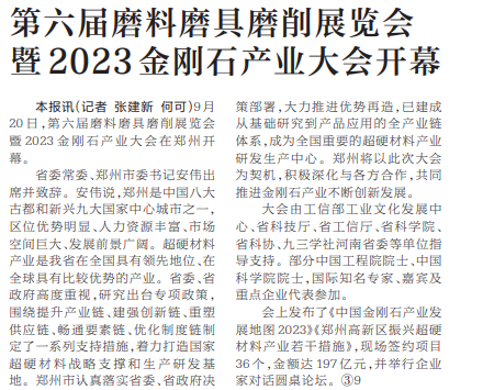 9月20日,第六届磨料磨具磨削展览会暨2023金刚石产业大会在郑州开幕。(今日《河南日报》2版)