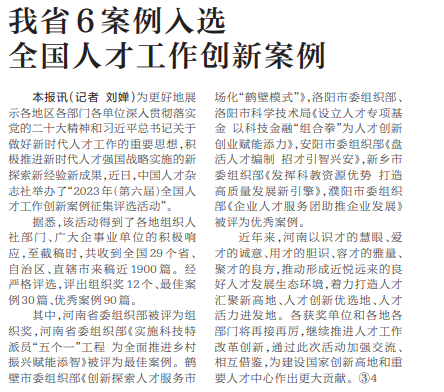 为更好地展示各地区各部门各单位深入贯彻落实党的二十大精神和习近平总书记关于做好新时代人才工作的重要思想,积极推进新时代人才强国战略实施的新探索新经验新成果,近日,中国人才杂志社举办了“2023年(第六届)全国人才工作创新案例征集评选活动”。(今日《河南日报》2版)