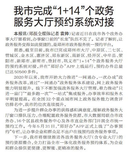 记者近日在我市各个政务办事大厅里看到,办事窗口前的“长龙”队伍不见了。记者了解到,让政务服务变得如此便捷的,是郑州市政务服务统一预约平台。(今日《郑州日报》2版)