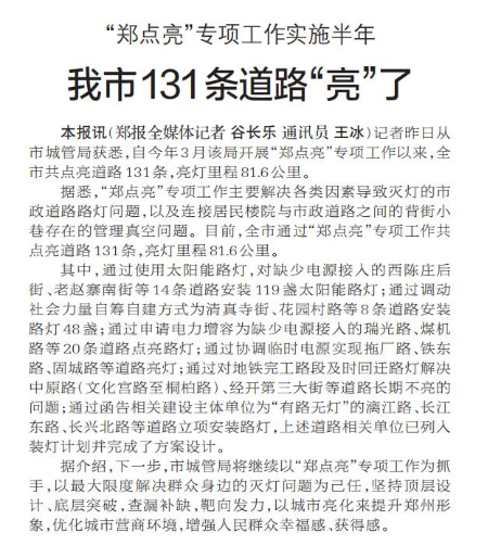 记者昨日从市城管局获悉,自今年3月该局开展“郑点亮”专项工作以来,全市共点亮道路131条,亮灯里程81.6公里。(今日《郑州日报》2版)