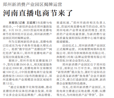 当直播与电商结合,一个新经济业态在郑州蓬勃发展。9月19日,2023首届河南直播电商节在郑州经开区启动,郑州新消费产业园区同时揭牌运营。(今日《河南日报》3版)