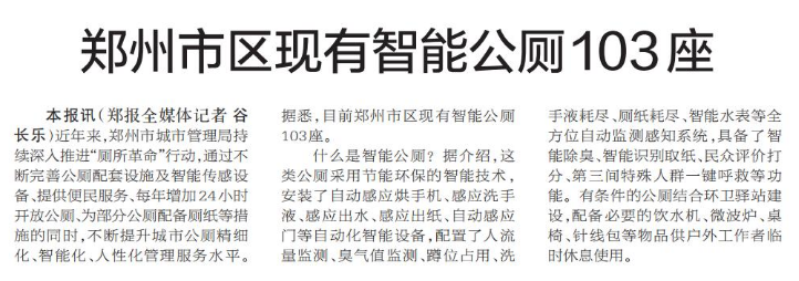 近年来,郑州市城市管理局持续深入推进“厕所革命”行动,通过不断完善公厕配套设施及智能传感设备、提供便民服务、每年增加24小时开放公厕、为部分公厕配备厕纸等措施的同时,不断提升城市公厕精细化、智能化、人性化管理服务水平。据悉,目前郑州市区现有智能公厕103座。(今日《郑州日报》5版)