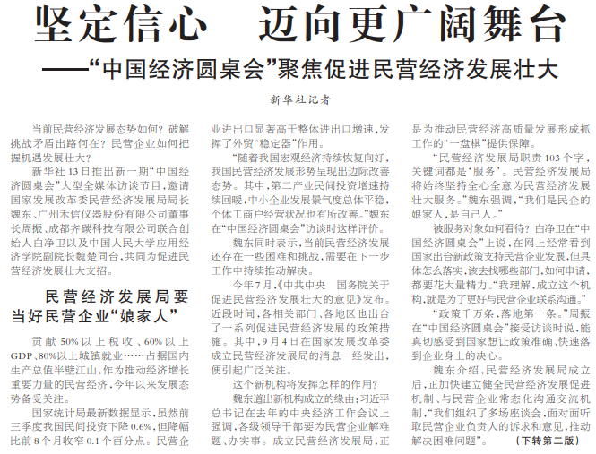 新华社13日推出新一期“中国经济圆桌会”大型全媒体访谈节目,邀请国家发展改革委民营经济发展局局长魏东、广州禾信仪器股份有限公司董事长周振、成都齐碳科技有限公司联合创始人白净卫以及中国人民大学应用经济学院副院长魏楚同台,共同为促进民营经济发展壮大支招。(今日《人民日报》1版、2版)